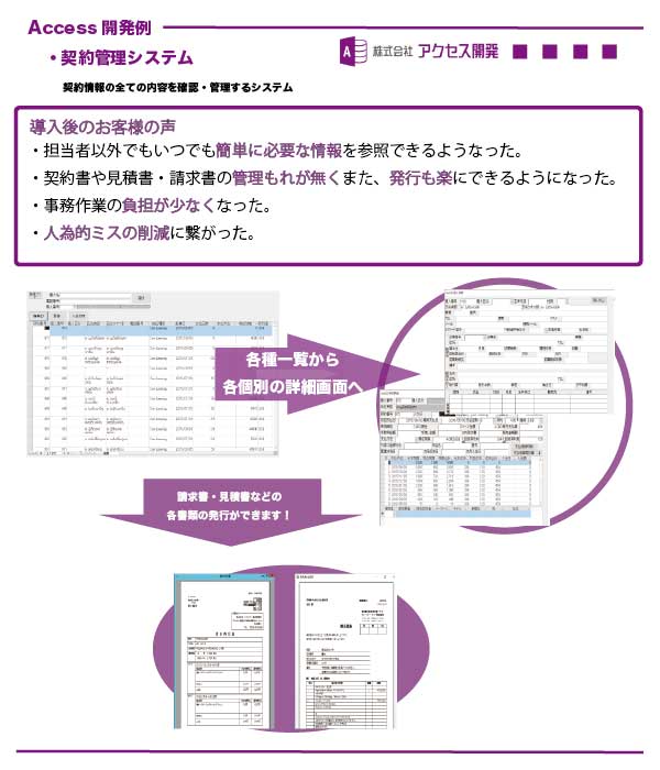 ACCESS(アクセス)専門開発の利点は、Access(アクセス)に特化しているので、「早く」 ・「安い」・「確実」 が特長でプロフェッショナルな確実なシステムを構築できます。